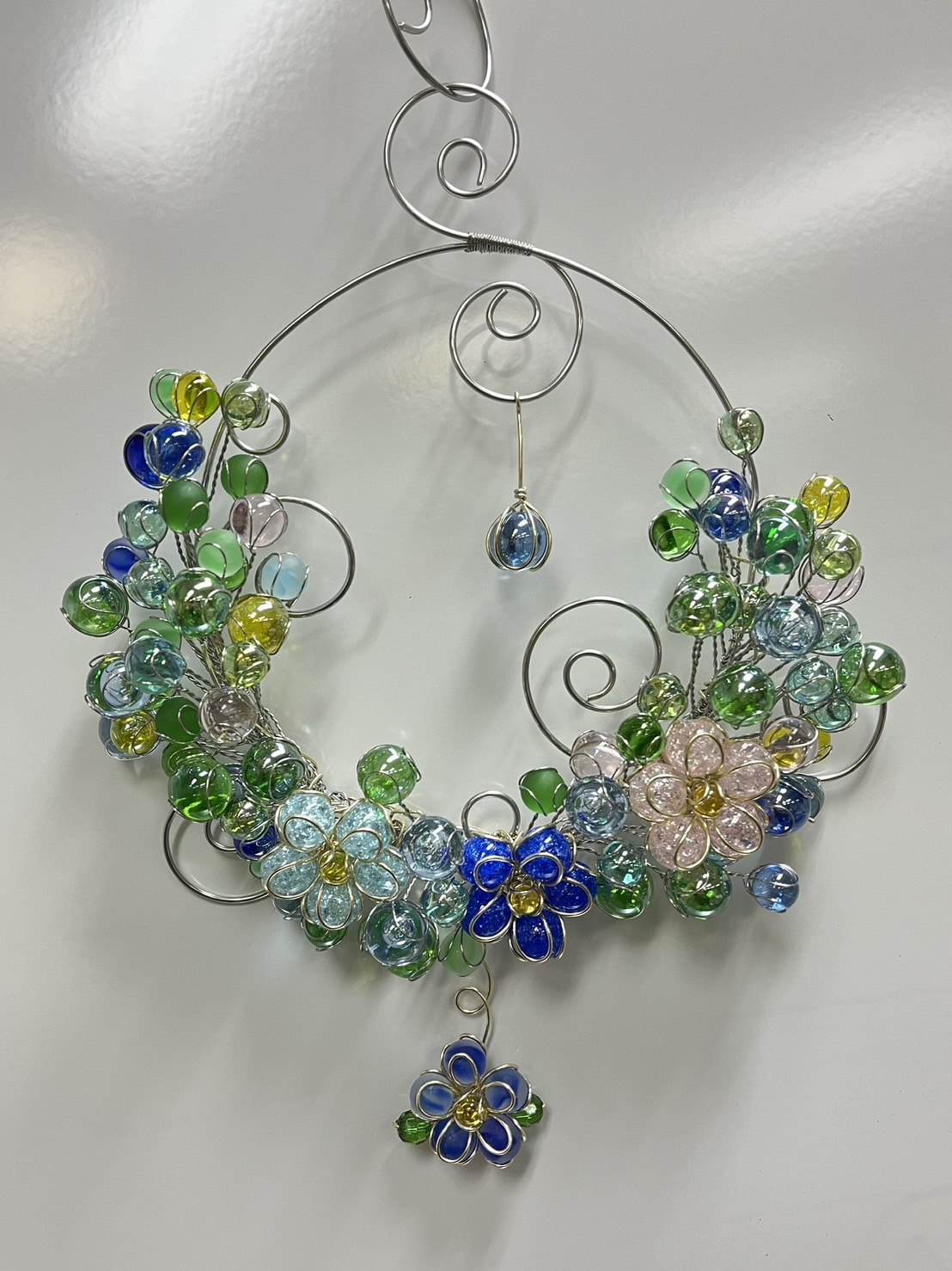 ルームアクセサリーリーフは、平成29年4月末の日本ホビーショーでのリクエスト作品です。ビー玉を使ったお花の作り方やリーフビーズの取り付け方、ワイヤーを使ったリーフの作り方など応用できる技術がいっぱいです。単品としても、雑貨のデコにも楽しんで頂ける作品です。